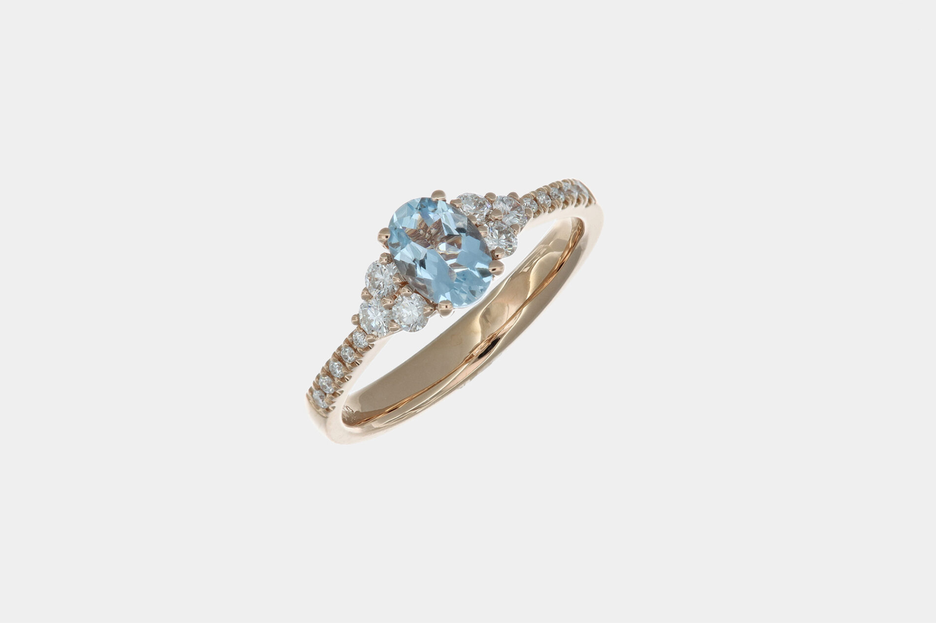 La montatura è realizzata interamente in oro rosa 18 carati, ed è studiata per esaltare la bellezza della gemma. L’acquamarina è esattamente al centro, ed ai lati vi è un piccolo pavé di diamanti taglio “tondo brillante” di colore “F” e dalla purezza “VS2” che arriva fino a metà del gambo dell’anello. Una soluzione molto richiesta nella gioielleria moderna, perché illumina e da risalto alla gemma centrale.