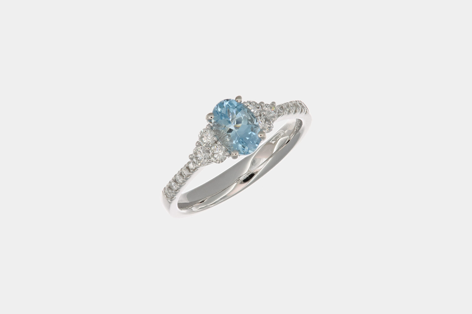 La montatura è realizzata interamente in oro bianco 18 carati, ed è studiata per esaltare la bellezza della gemma. L’acquamarina è esattamente al centro, ed ai lati vi è un piccolo pavé di diamanti taglio “tondo brillante” di colore “F” e dalla purezza “VS2” che arriva fino a metà del gambo dell’anello. Una soluzione molto richiesta nella gioielleria moderna, perché illumina e da risalto alla gemma centrale.