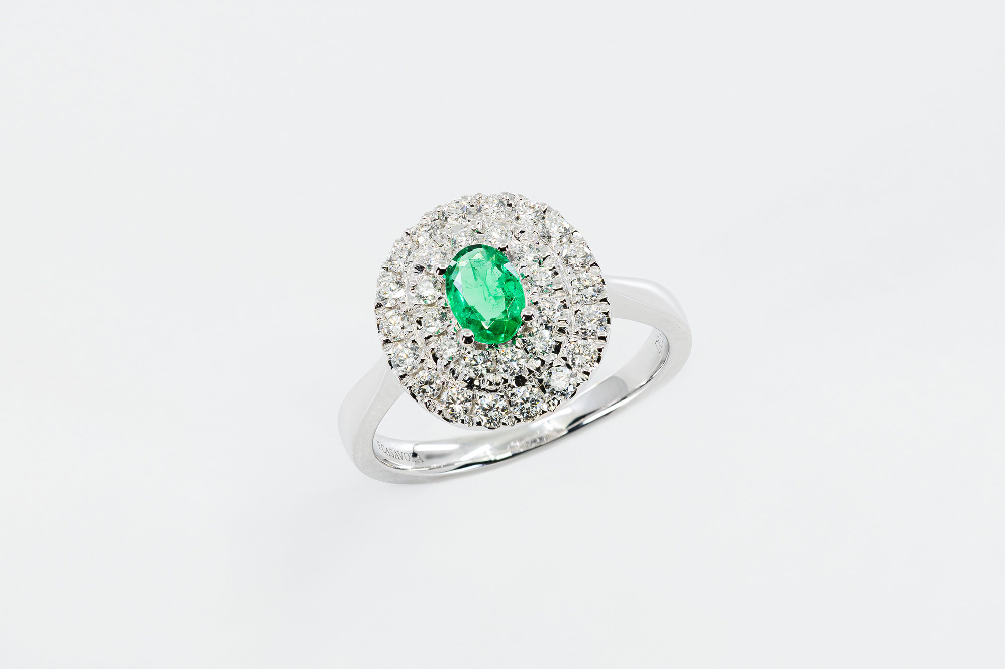 Sinuoso, elegante e dalla lucentezza incredibile: questo è l’anello modello “Double Halo” con smeraldo ovale e pavé di diamanti della Gioielleria Casavola di Noci.