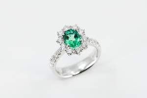 Realizzata interamente in oro bianco, la montatura è un piccolo prodigio di arte orafa. Come si può notare, la struttura dell’anello deve ospitare molti diamanti. E deve sostenere soprattutto uno o più diamanti centrali, di caratura leggermente superiore ai piccoli diamanti di contorno.