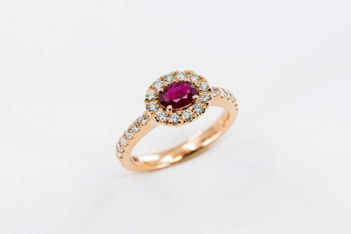 La montatura, realizzata interamente in oro rosa 18 carati, esalta la bellezza della gemma. Il rubino è al centro, e tutt’attorno vi è un meraviglioso pavé di diamanti taglio tondo brillante che arriva fino al gambo della montatura. Una scintillante e preziosa decorazione.