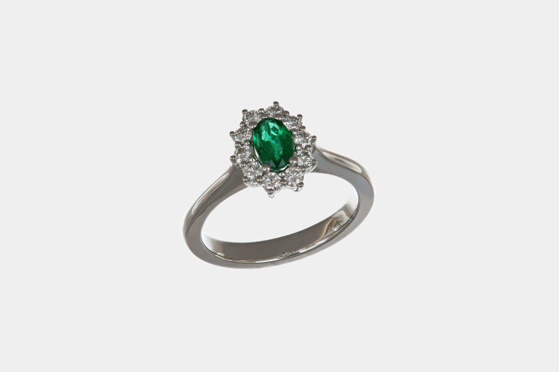 Anche le pietre di taglio ovale si prestano molto bene. Se adornate con il giusto pavé di diamanti, si possono realizzare gioielli che assomigliano molto a dei girasoli. Come ad esempio questo anello con smeraldo di provenienza “Zambia” modello “Sunflower” in oro bianco. In linea di massima, la fantasia è la trave portante di questa collezione.