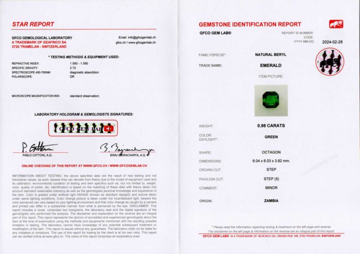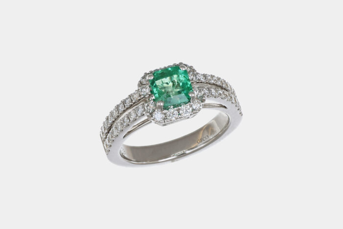 Questo anello smeraldo 0.98 ct pavé Prestige White è appunto un gioiello “di forma” che si sviluppa proprio da una gemma taglio “ottagono”. Per la precisione, un smeraldo di provenienza “Zambia” provvisto di certificato del laboratorio svizzero di Gemmologia “GFCO”. Quindi una pietra preziosa analizzata minuziosamente da mani esperte e selezionata in base alle sue caratteristiche univoche.