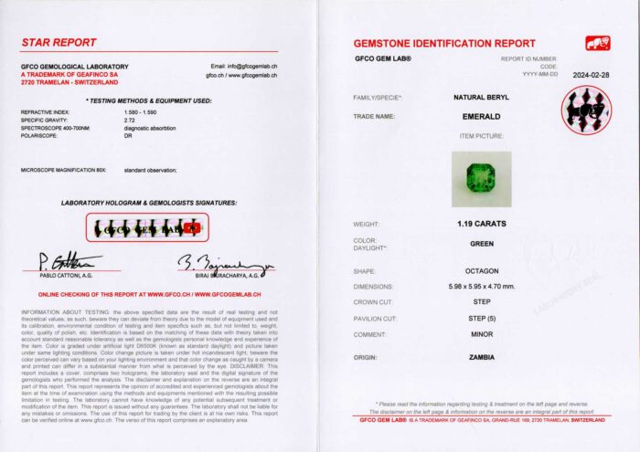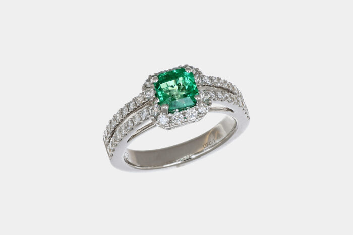 Questo anello smeraldo 1.19 ct pavé Prestige White è appunto un gioiello “di forma” che si sviluppa proprio da una gemma taglio “ottagono”. Per la precisione, un smeraldo di provenienza “Zambia” provvisto di certificato del laboratorio svizzero di Gemmologia “GFCO”. Quindi una pietra preziosa analizzata minuziosamente da mani esperte e selezionata in base alle sue caratteristiche univoche.