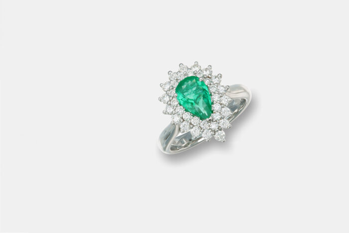 Questo anello della collezione Prestige è appunto un gioiello di forma che si sviluppa proprio da una gemma taglio “goccia”. Per la precisione, uno smeraldo certificato. Ed una pietra certificata ha sempre un valore aggiunto, sia per qualità che per caratteristiche.