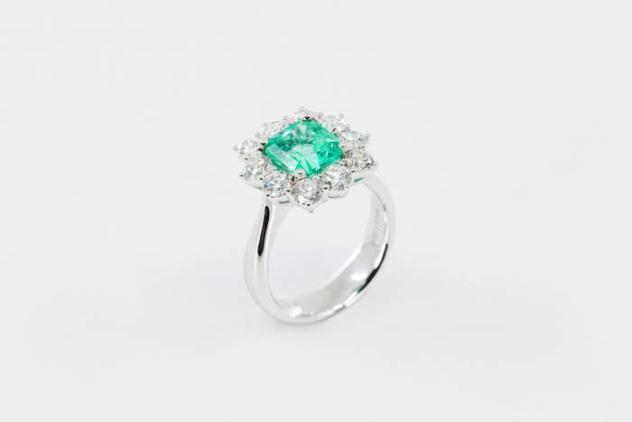 La montatura è realizzata interamente in oro bianco 18 carati, ed è studiata per esaltare la bellezza della gemma. Lo smeraldo è al centro, e tutt’attorno vi è un meraviglioso pavé di diamanti taglio tondo brillante. Una splendida “rosetta”, che è valorizzata dalla brillantezza dei diamanti. Il cui colore è stato scelto per esaltare la bellezza dello smeraldo.