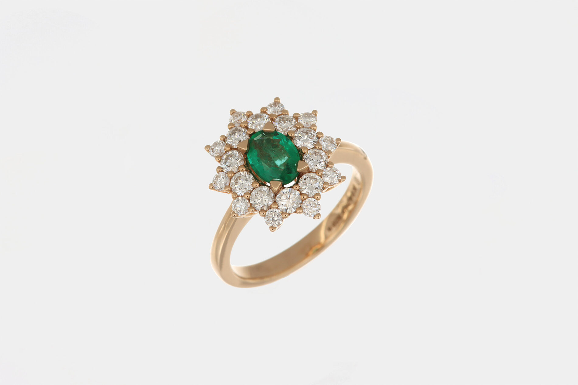 Anello smeraldo Star Anise Nature Rosè è un gioiello ispirato alle forme ed ai colori della natura. Un anello in oro rosa su cui spicca un bellissimo smeraldo taglio ovale certificato di provenienza Zambia con pavé di diamanti. Un gioiello dalle caratteristiche uniche ed inconfondibili. Un’opera della Gioielleria Casavola di Noci (BA).