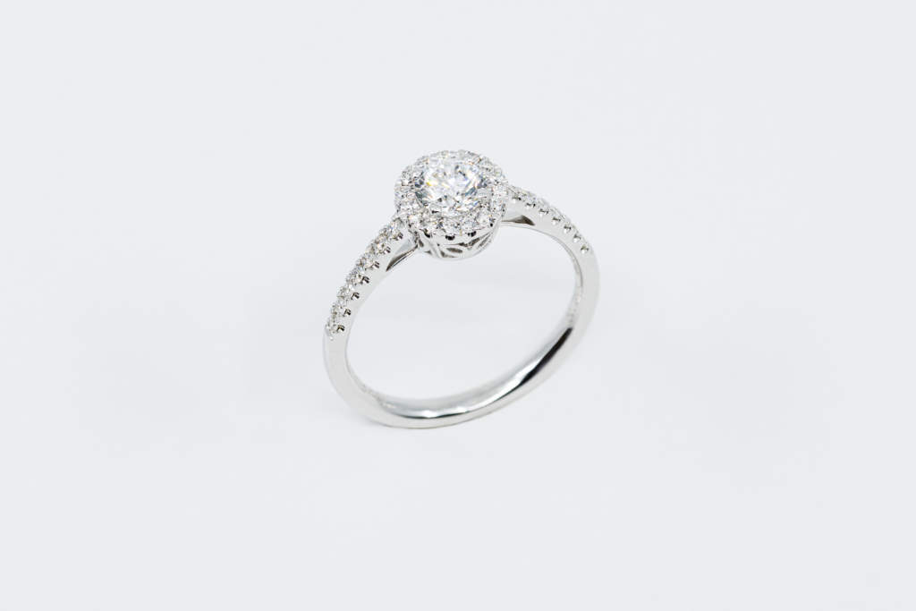 Anello solitario tondo pavé in oro bianco con diamante certificato realizzato dalla Gioielleria Casavola di Noci (BA).