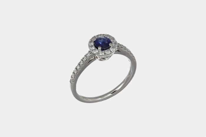 Questo splendido anello rientra appunto nella categoria di cui sopra. Una raffinata creazione in oro bianco 18 carati illuminata dal blu di uno zaffiro dalla ricercata colorazione “Ceylon”. Una pietra selezionata appositamente per le sue caratteristiche di colore e per il taglio, un pregiato “tondo brillante”.