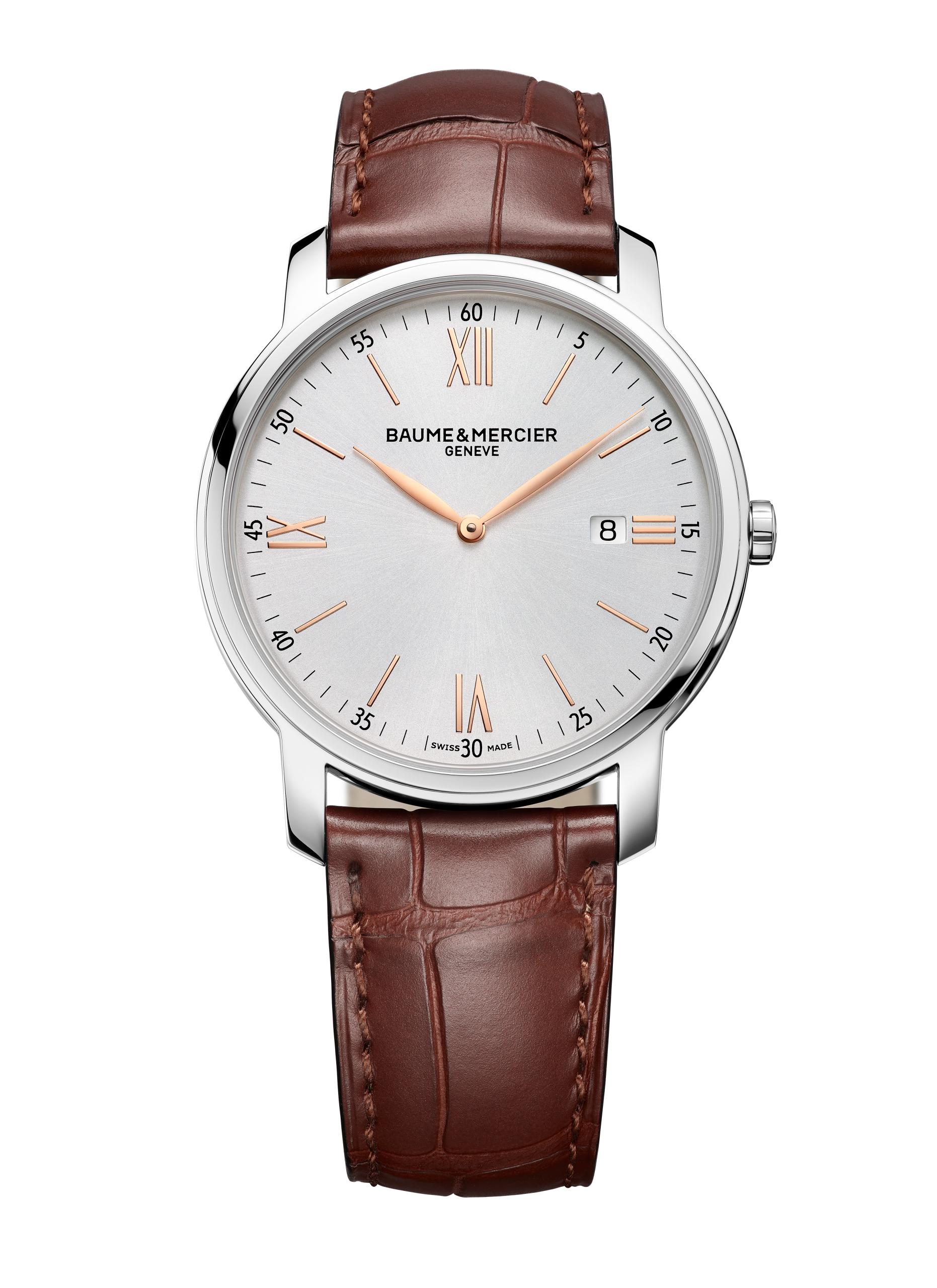 Il quadrante, ben visibile grazie al vetro in zaffiro, è di colore argentato “satin”. Una scelta “vintage” che ben si abbina alla combinazione di indici romani/bastoni color oro rosa del Baume et Mercier Classima 10144. Sono color oro rosa anche le lancette “foglia”, mentre il datario è praticamente quello fornito dalla ETA nel calibro F06.111.