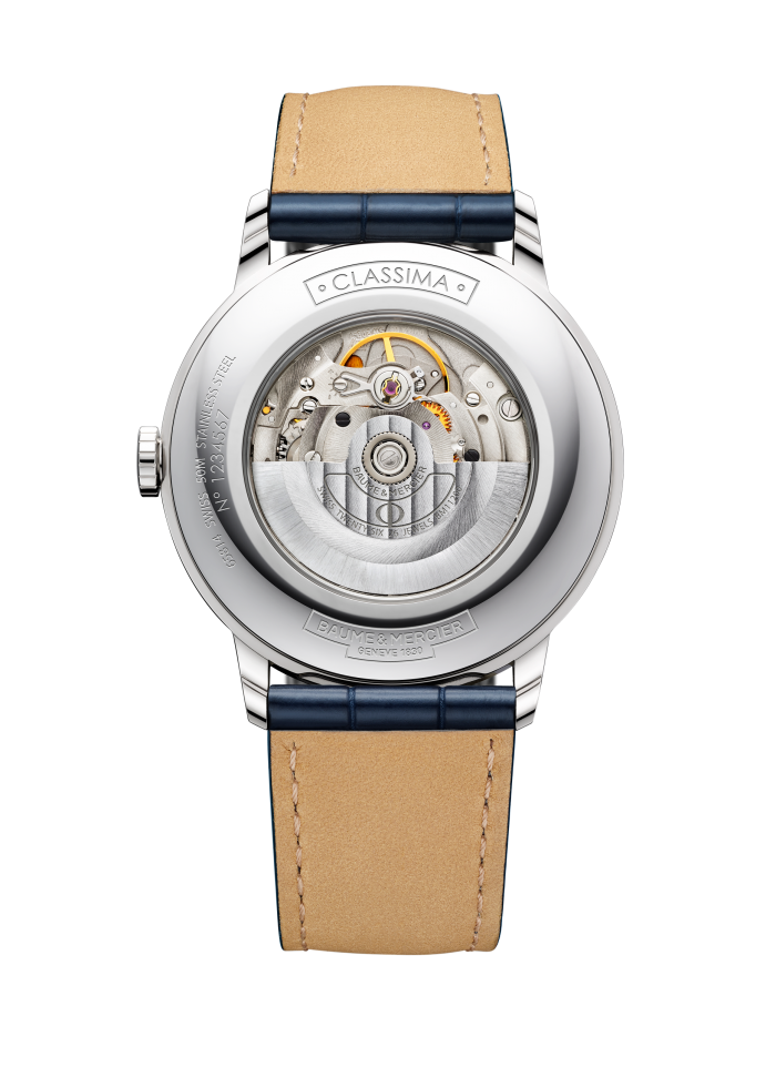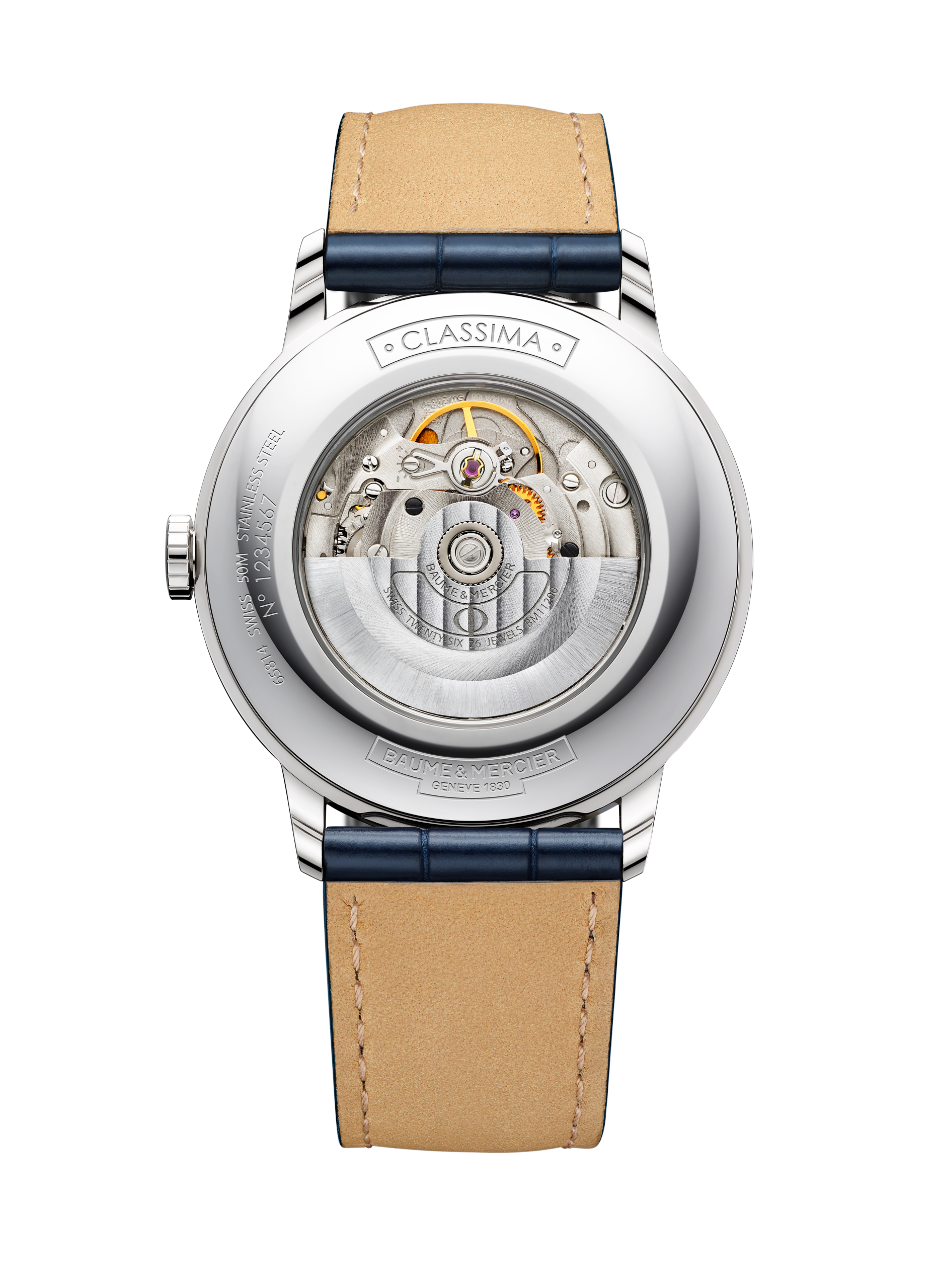 Partiamo dalla cassa, costruita in acciaio INOX e dal diametro 42 mm per 8,95 mm di profondità: di forma rotonda e dal colore acciaio, la cassa è ovviamente antigraffio, resistente e lucida. Nel “cuore” del Baume et Mercier Classima 10333 troviamo il calibro Sellita SW200, movimento automatico da 26 rubini con riserva di carica stimata attorno alle 38 ore. Movimento ben visibile grazie anche al fondello in vetro zaffiro dell’orologio.