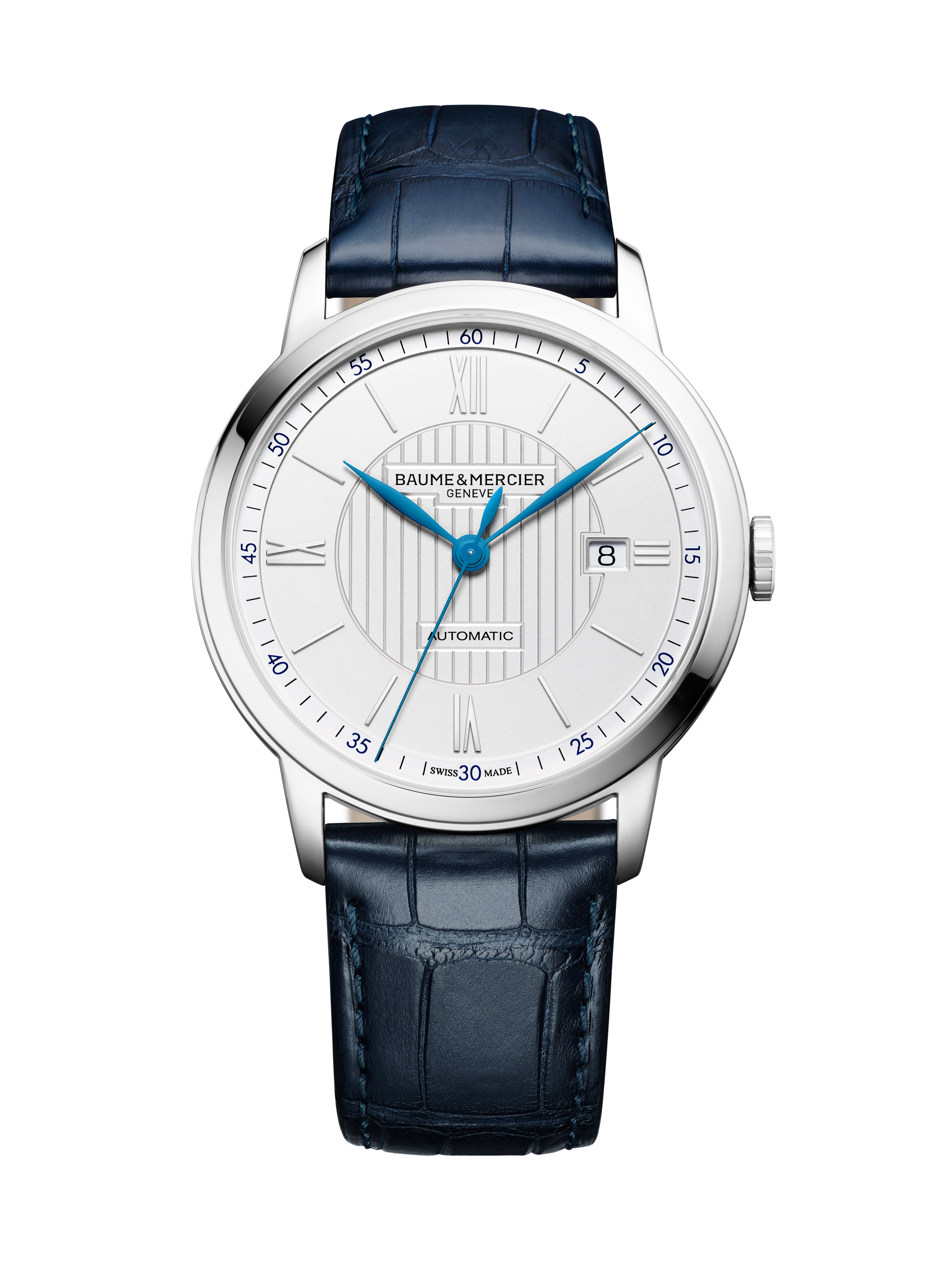 Il quadrante, ben visibile grazie al vetro in zaffiro, è di colore argentato/opalino con linee “Guilloché” come decorazione. Una scelta “vintage” che ben si abbina alla combinazione di indici romani/bastoni color argento del Baume et Mercier Classima 10333. Sono invece color acciaio azzurrato le lancette “foglia”, mentre il datario è praticamente quello fornito dalla Sellita nel calibro SW200.