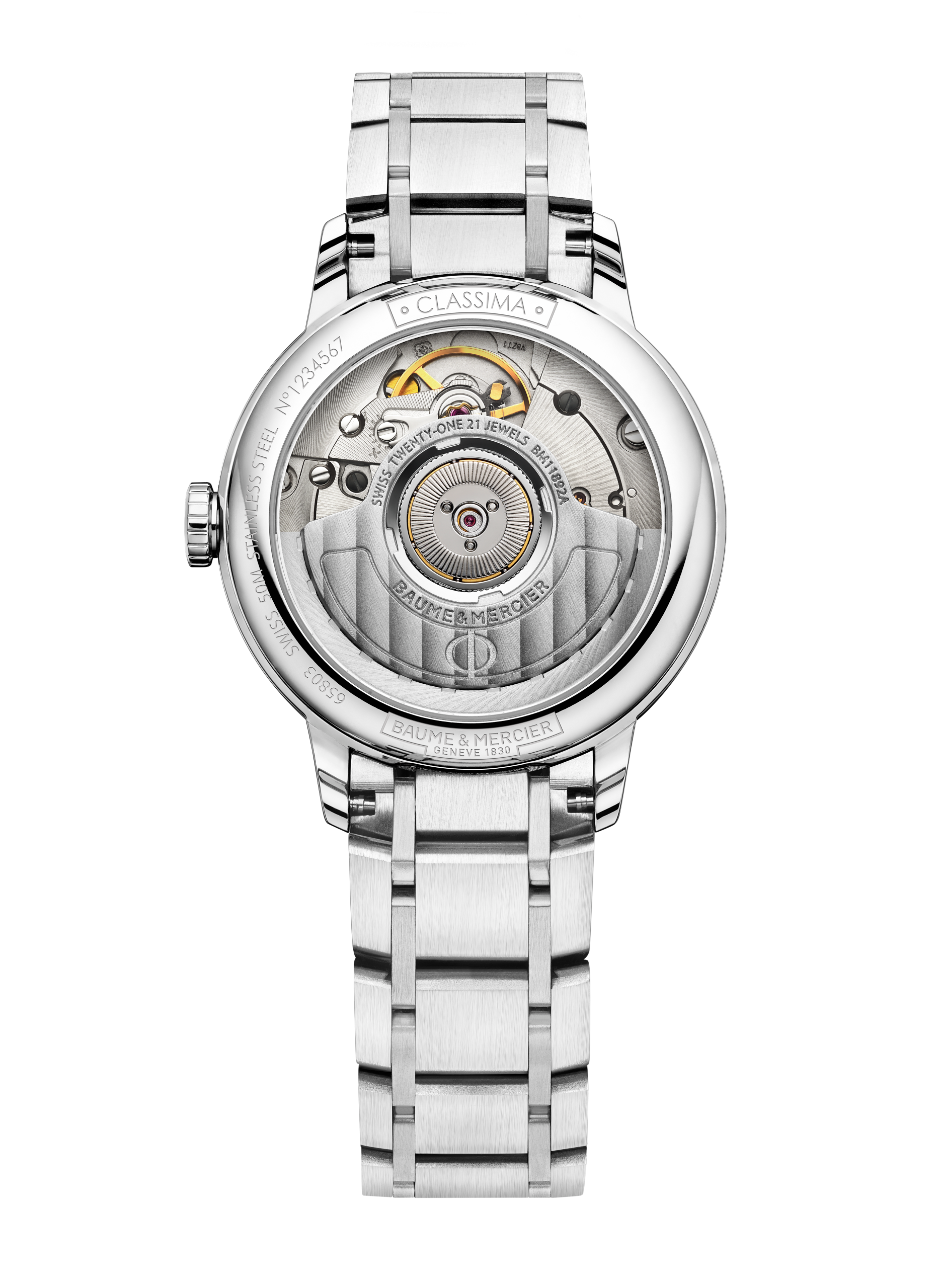 Partiamo dalla cassa, costruita in acciaio INOX e dal diametro 31,5 mm per 8,15 mm di profondità: di forma rotonda e dal colore acciaio, la cassa è ovviamente antigraffio, resistente e lucida. Nel “cuore” del Baume et Mercier Classima Lady 10268 troviamo il calibro ETA 2892-A2, movimento automatico da 21 rubini con riserva di carica stimata attorno alle 42 ore. Movimento ben visibile grazie anche al fondello in vetro zaffiro dell’orologio.