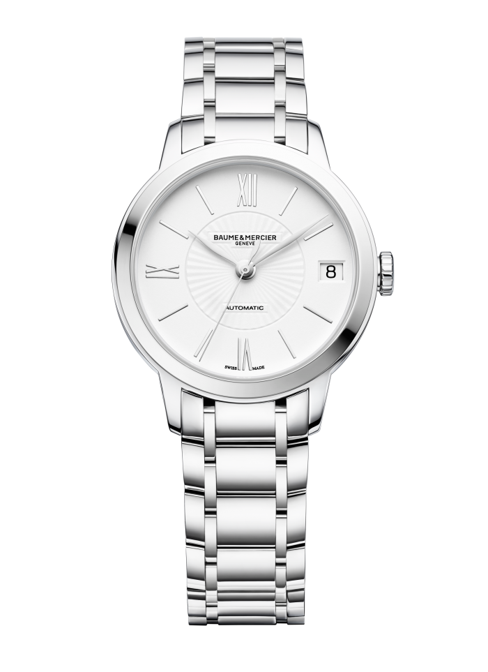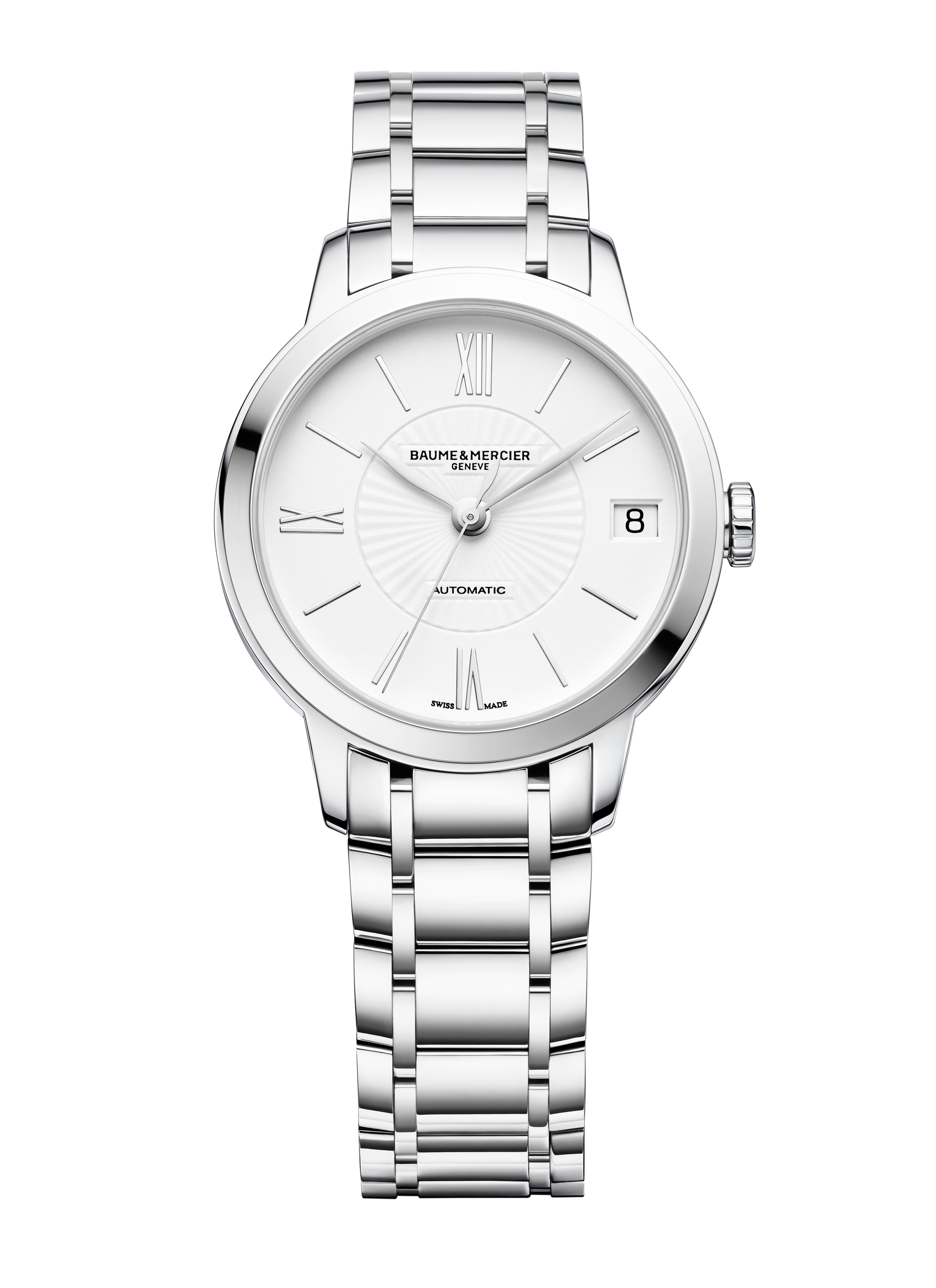 Sobrio e per nulla banale è il quadrante bianco con finiture “Guilloché soleil” del Baume et Mercier Classima Lady 10267, dove le lancette “foglia” placcato rodio argentate si sposano perfettamente con gli indici a bastoni/romani dell’orologio.