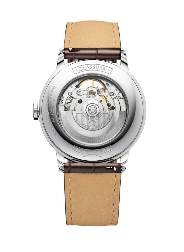 Nel “cuore” del Baume et Mercier Classima M0A10524 batte il famoso calibro Sellita SW200 BV, movimento automatico preciso ed affidabile. Esteticamente molto bello, è possibile ammirarlo in funzione direttamente ad ore 12 del quadrante. Le due piccole finestre mostrano infatti il bilancere in funzione, ed aggiungono un tocco esclusivo a questo splendido orologio.