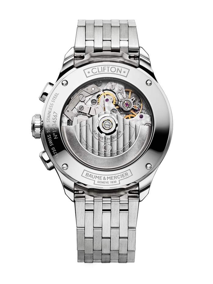 All’interno del Baume et Mercier Clifton 10130 troviamo infatti il calibro Valjoux 7750, movimento automatico con funzioni quali cronografo e datario con giorni della settimana. Il calibro è inoltre ben protetto da un fondo cassa in vetro zaffiro con viti che ne garantisce l’integrità e funzionalità.