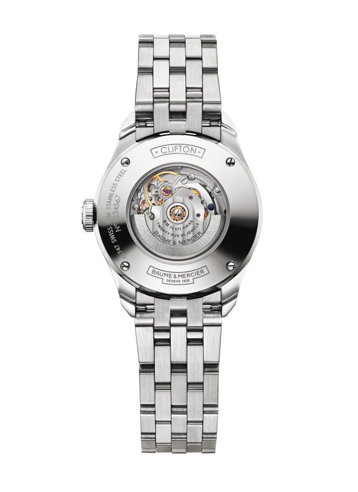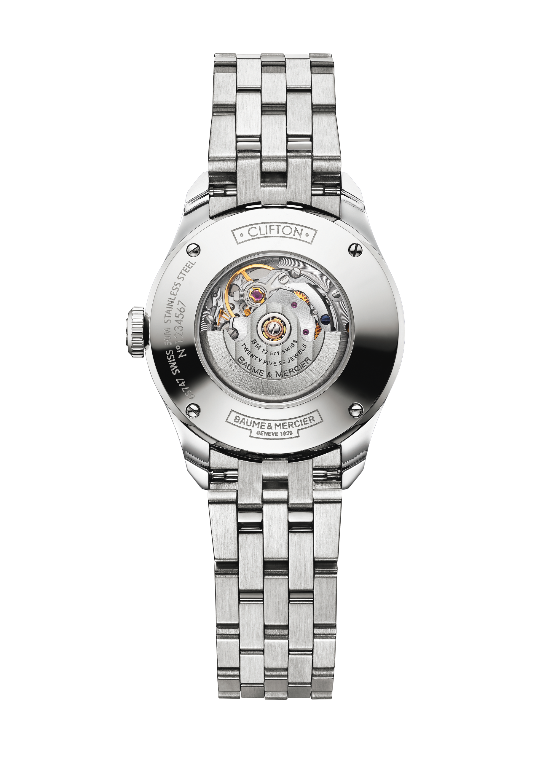 Partiamo dalla cassa, costruita acciaio INOX lucido satinato dal diametro di 30 mm per 9,94 mm di profondità: di forma rotonda, la cassa è ovviamente antigraffio, resistente e lucida. Il vetro zaffiro con trattamento antiriflesso è invece una chicca inserita da Baume et Mercier su tutti i Clifton che, essendo orologi pensati anche per donne eleganti e sportive, sono realizzati in modo che la loro funzionalità e bellezza possa emergere in ogni situazione.