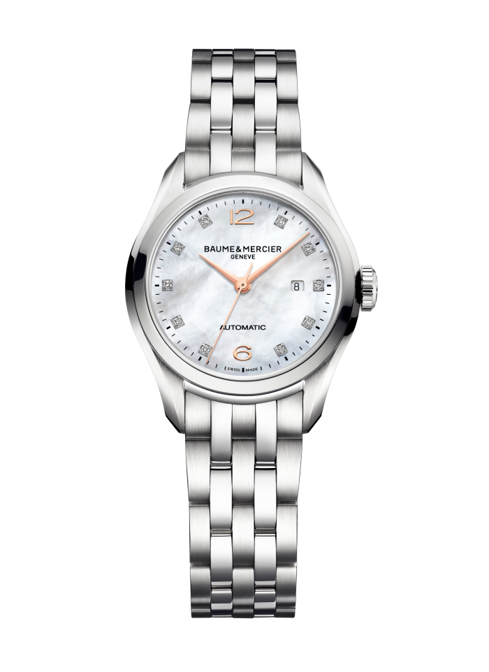 Il quadrante, ben visibile grazie al vetro in zaffiro, è in madreperla bianco. Una scelta sontuosa ed elegante, che ben si abbina alla combinazione di indici con diamanti da 0,06 ct del Baume et Mercier Clifton 10151. Le lancette “foglia” sono invece color oro rosso, armoniose e perfettamente in linea con i colori di questa piccola creazione.