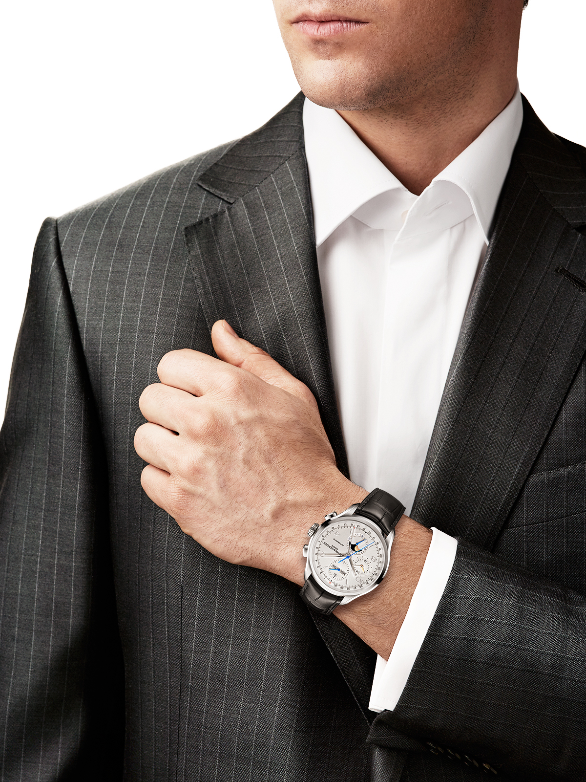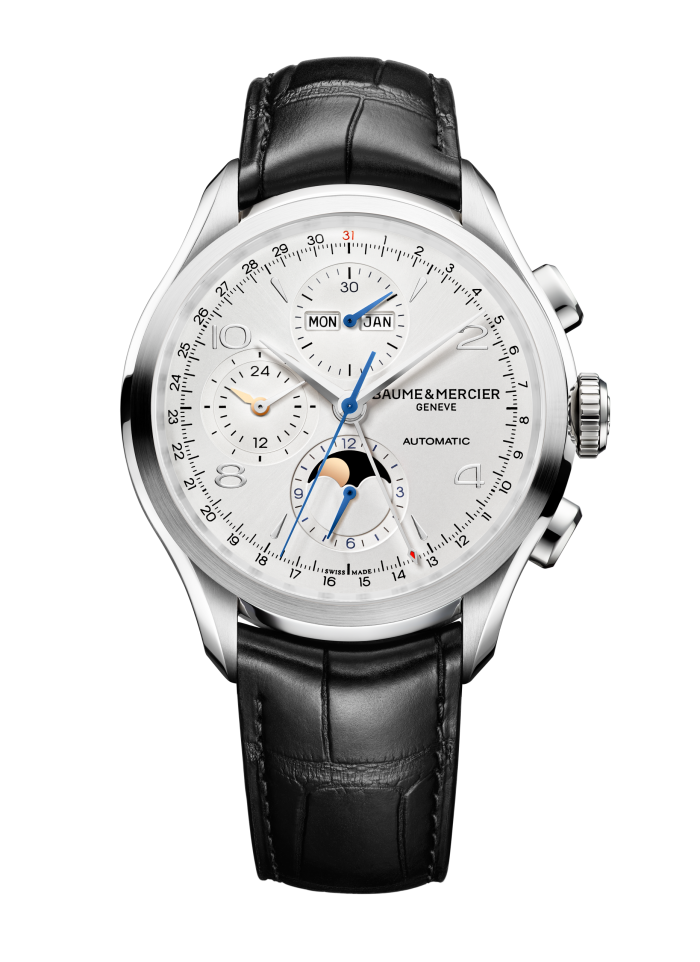 Il quadrante, ben visibile grazie al vetro in zaffiro, è di colore argentato con finitura satinata soleil. Una scelta “vintage” che ben si abbina alla combinazione di indici in numeri arabi/bastoni argentati del Baume et Mercier Clifton 10278. Sono argentate anche le lancette “dauphine” dell’orologio mentre, come potete vedere, le parti mobili che compongono le complicazioni dell’orologio sono quelle tipiche del calibro Valjoux. Da notare la lancetta dei secondi, qui realizzata in un carinissimo azzurro.