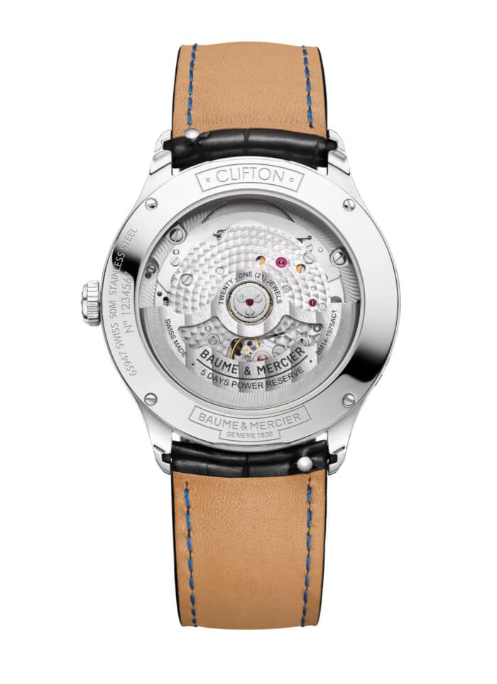 Il calibro può essere visto in azione dal fondello a vite in vetro zaffiro della cassa. Soluzione presente praticamente in tutte le versioni dei Clifton Baumatic. Compresa questa novità del 2024, che introduce ufficialmente nella collezione anche la funzione “fasi lunari”!