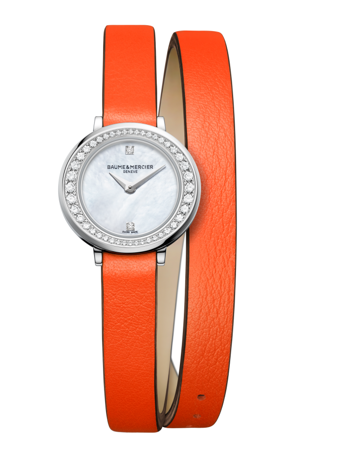 Particolare, morbido ed elegante il cinturino doppio giro in pelle di vitello color arancio con fibbia ardiglione, un dettaglio del Baume et Mercier Petite Promesse 10290 che non passerà sicuramente inosservato agli occhi di chi guarderà il polso delle signore che indosseranno questa meravigliosa creazione.