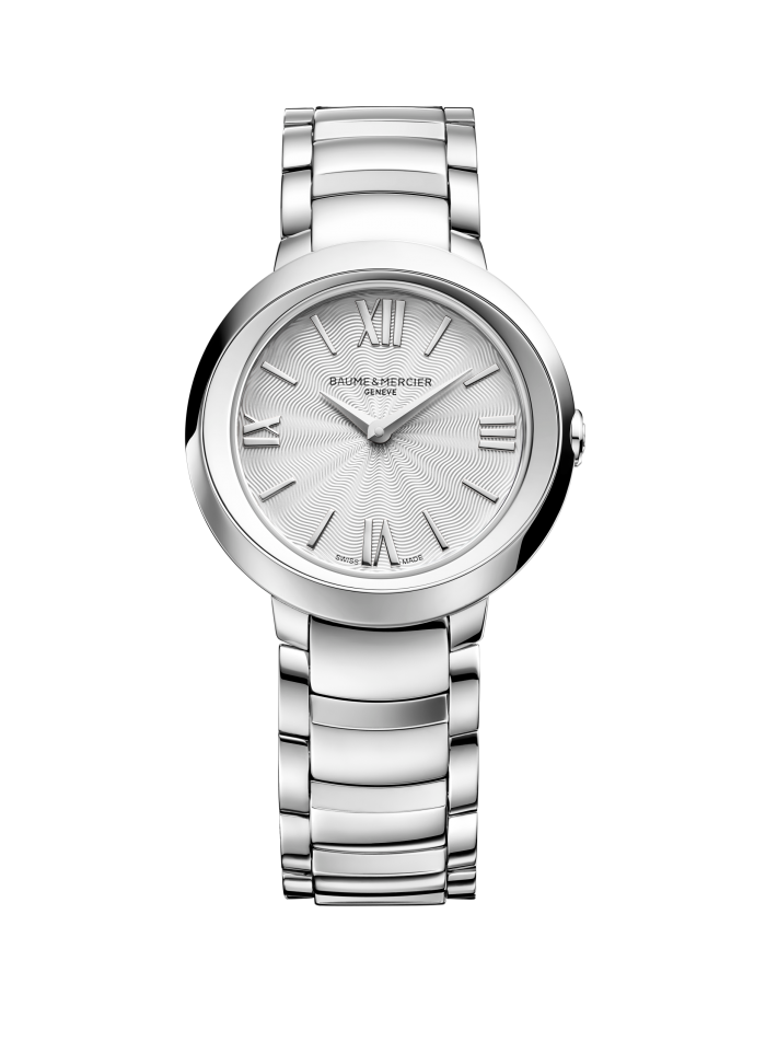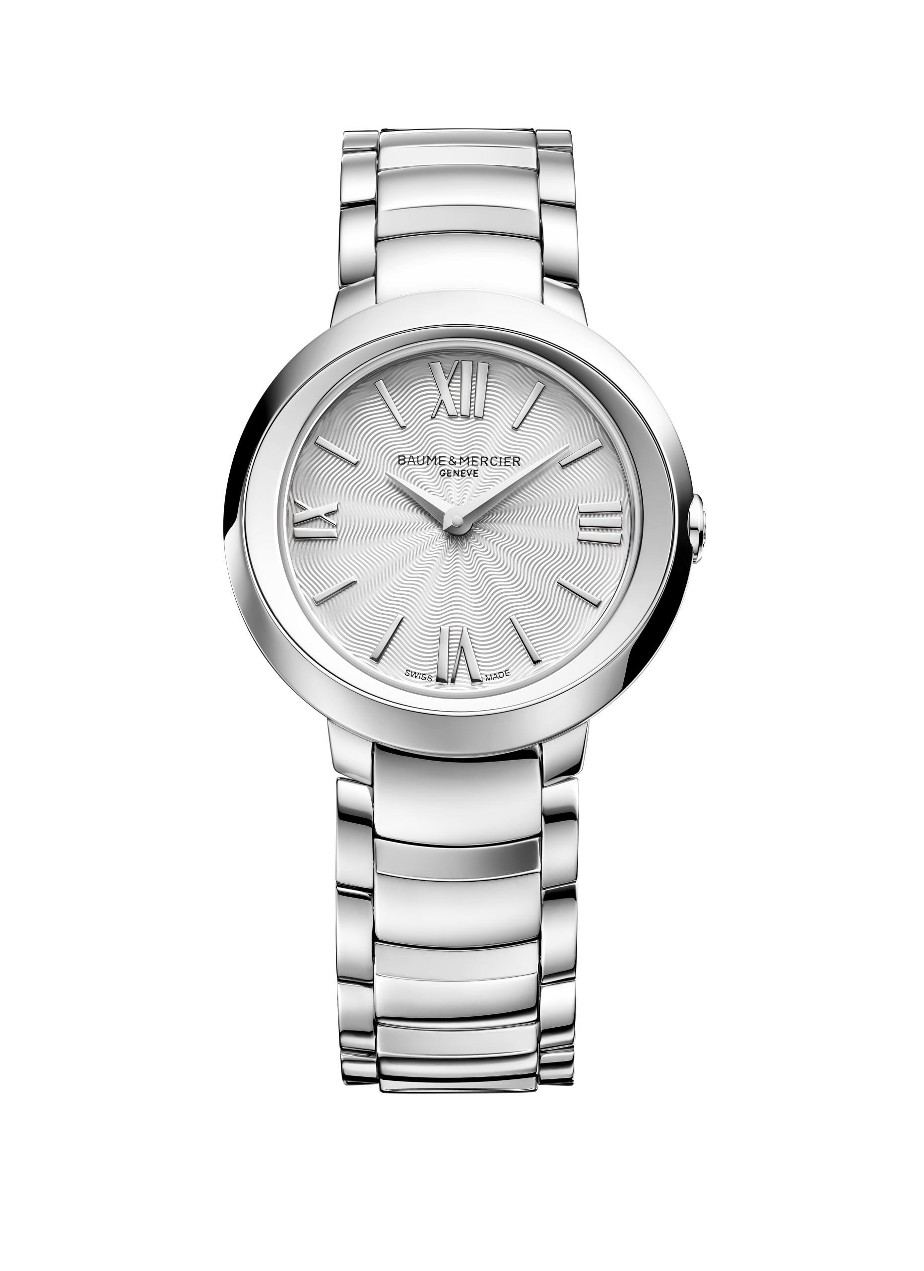 Il quadrante rotondo argentato con decoro “Guilloché Drapé” è molto bello, così come sono belle le lancette “Dauphine” color argento del Baume et Mercier Promesse 10157.