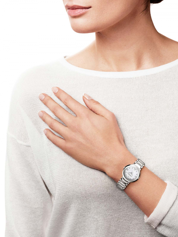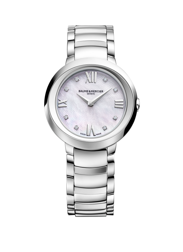 Il quadrante rotondo in madreperla bianco con otto diamanti da 0,03 ct. come indici è davvero molto bello, così come sono belle le lancette “Dauphine” color argento del Baume et Mercier Promesse 10158.