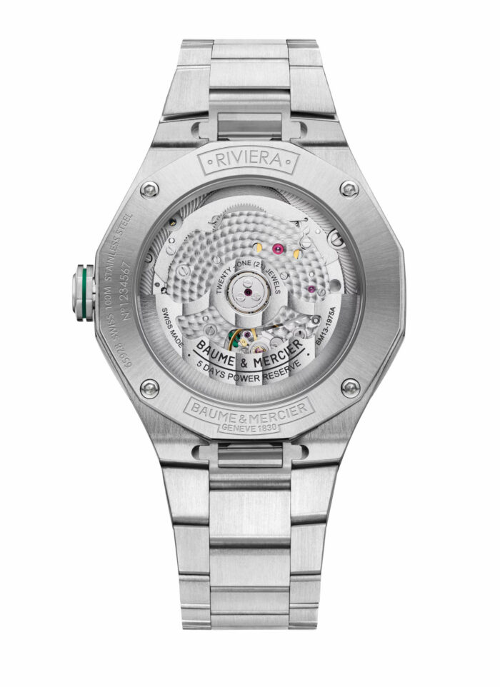 Calibro automatico o al quarzo sia per i modelli da uomo che per quelli da donna, ma la vera novità è rappresentata appunto dai Riviera Baumatic. Che come il nome lascia intendere, sono orologi che montano i prestigiosi calibri realizzati “in house” da Baume et Mercier. E sono tutti segnatempo con vetro zaffiro sfumato che mostrano i ruotismi del movimento. Da notare che questo Baume et Mercier Riviera M0A10770 ha appunto un quadrante trasparente colorato di verde, originale e fuori dagli schemi.