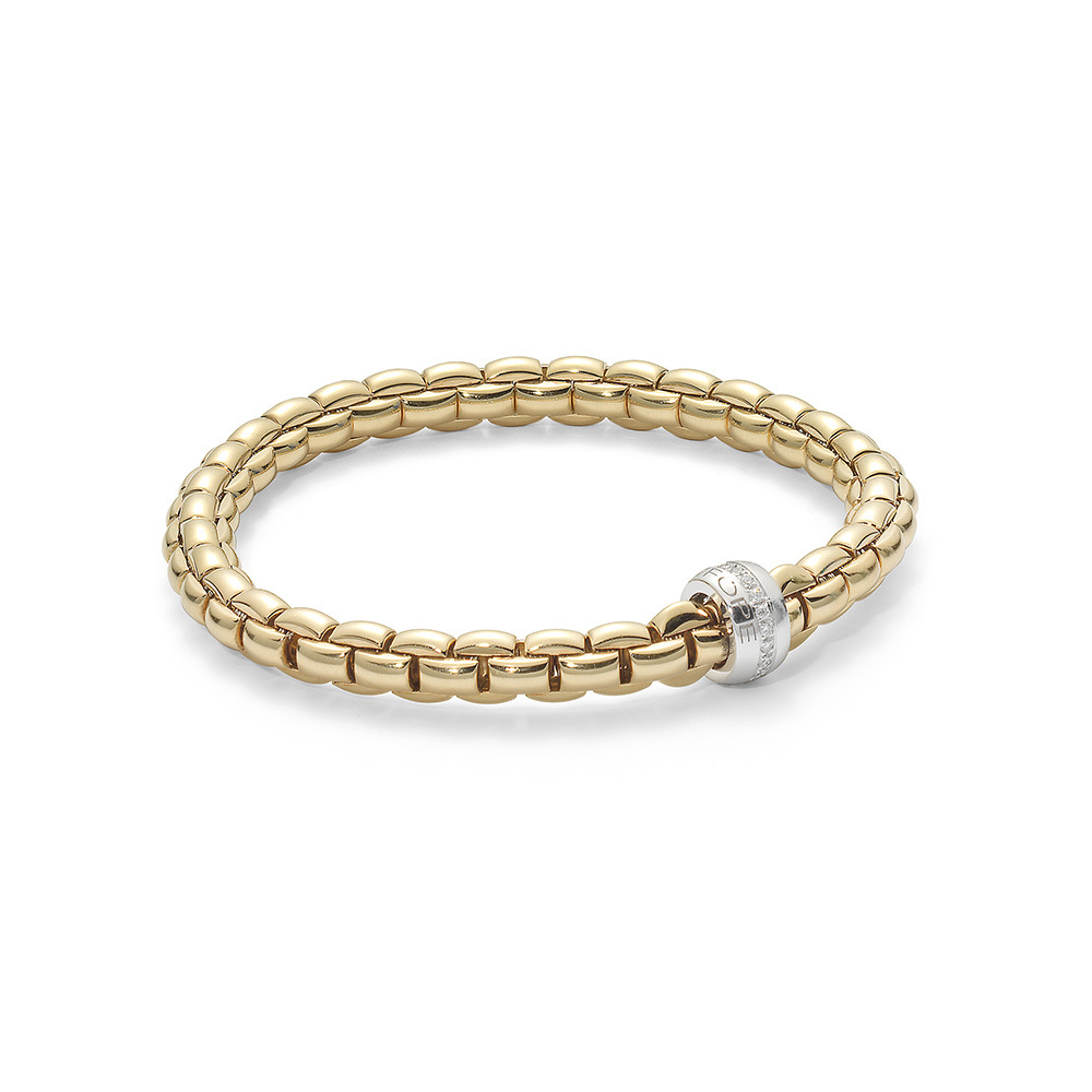 Bracciale Fope Eka in oro giallo con rondella in diamanti fa parte della più riconosciuta tra le collezioni di Fope. Un pezzo di altissima gioielleria “Made in Italy”.