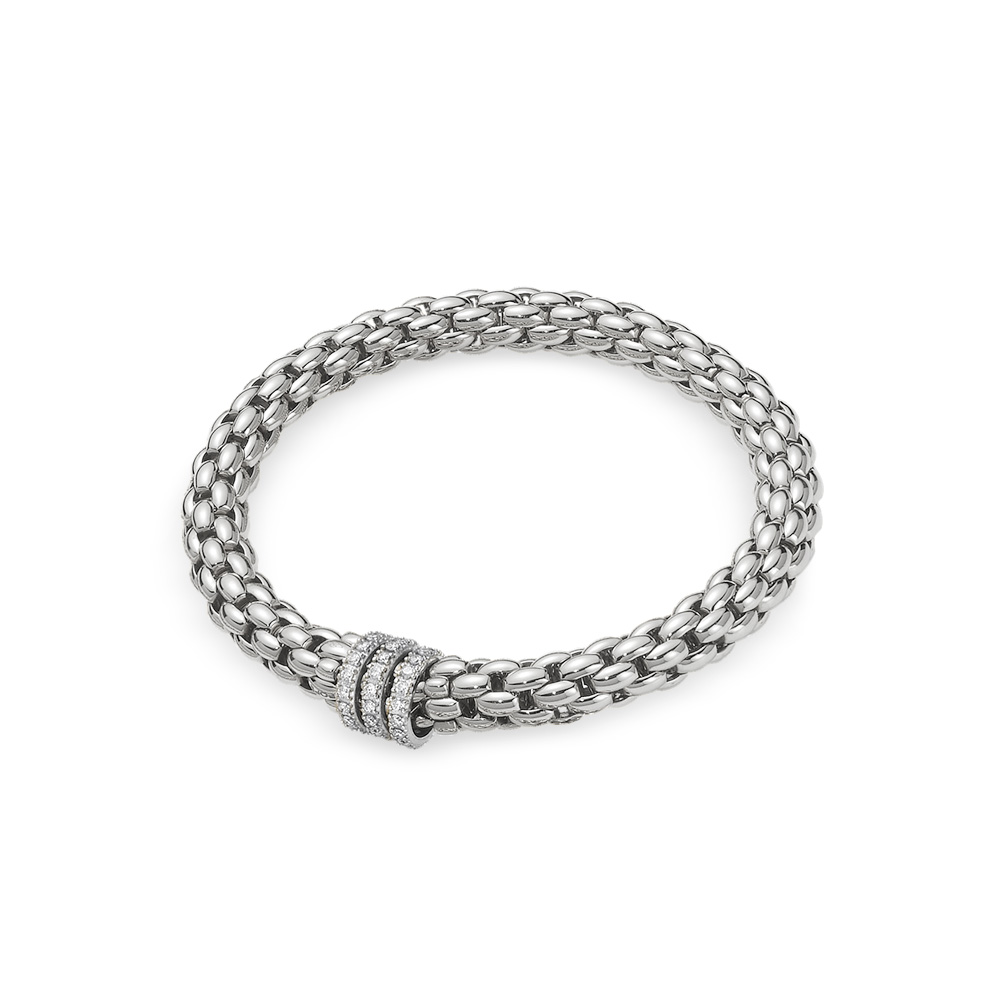 Bracciale Fope Niue in oro bianco con rondelle in diamanti fa parte di una collezione molto importante per Fope. Ed infatti, questo pezzo di altissima gioielleria “Made in Italy” è un vero e proprio simbolo della artigianalità di Fope.