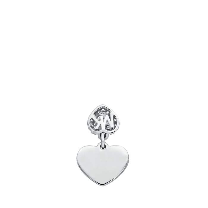 Diversamente dai precedenti modelli, qui abbiamo un doppio ciondolo a forma di cuore. Il ciondolo frontale è formato da un pavé di zirconia cubica, ed è più piccolo. Il ciondolo posto immediatamente dietro è leggermente più grande, e fa da “cornice mobile” al primo.