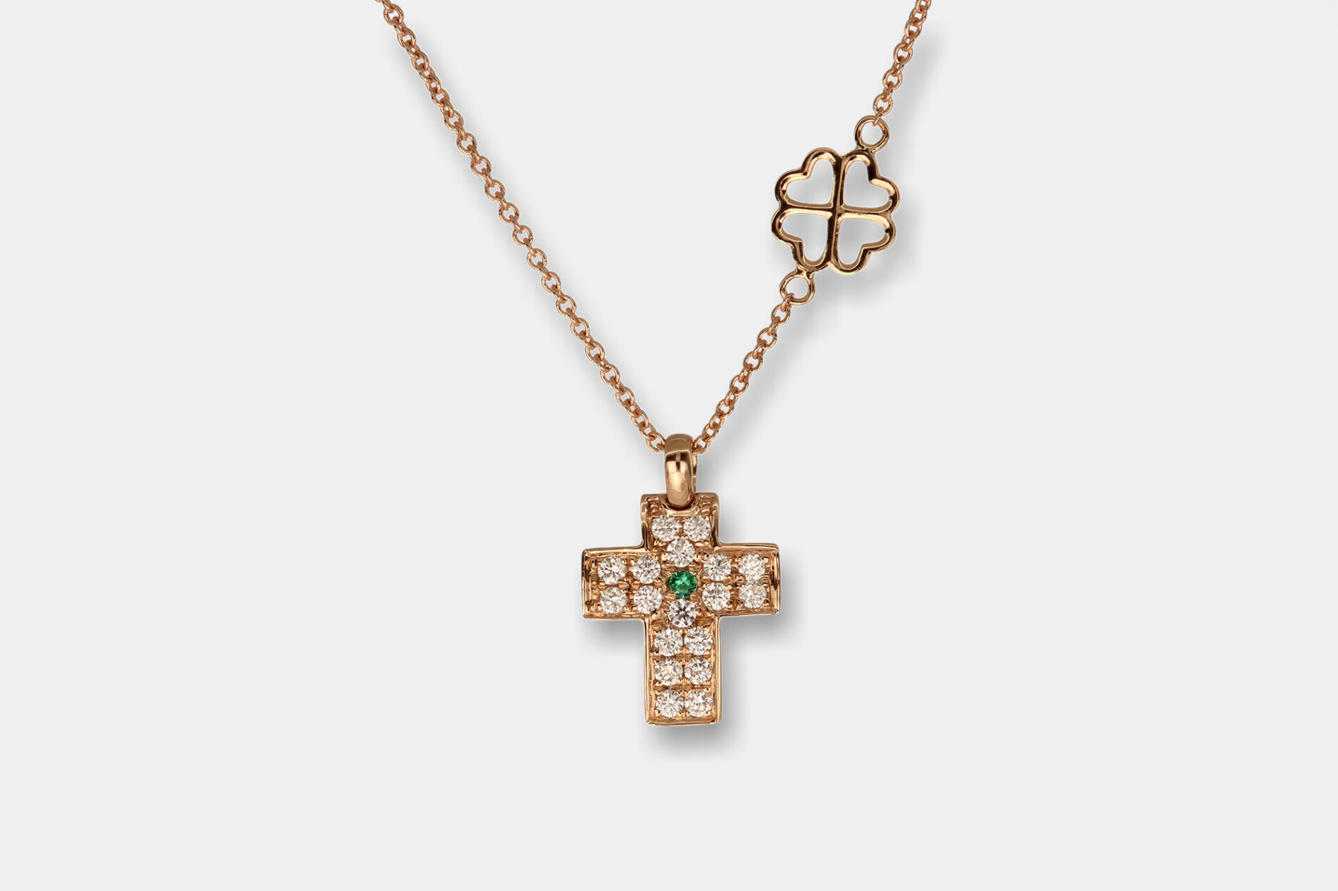 Collana croce diamanti e smeraldo Angelus Rosé Light – Una realizzazione semplice ma d’impatto