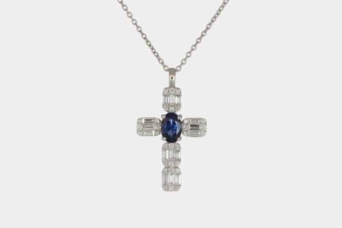 Collana croce diamanti e zaffiro Angelus Maior White – Una realizzazione semplice ma d’impatto