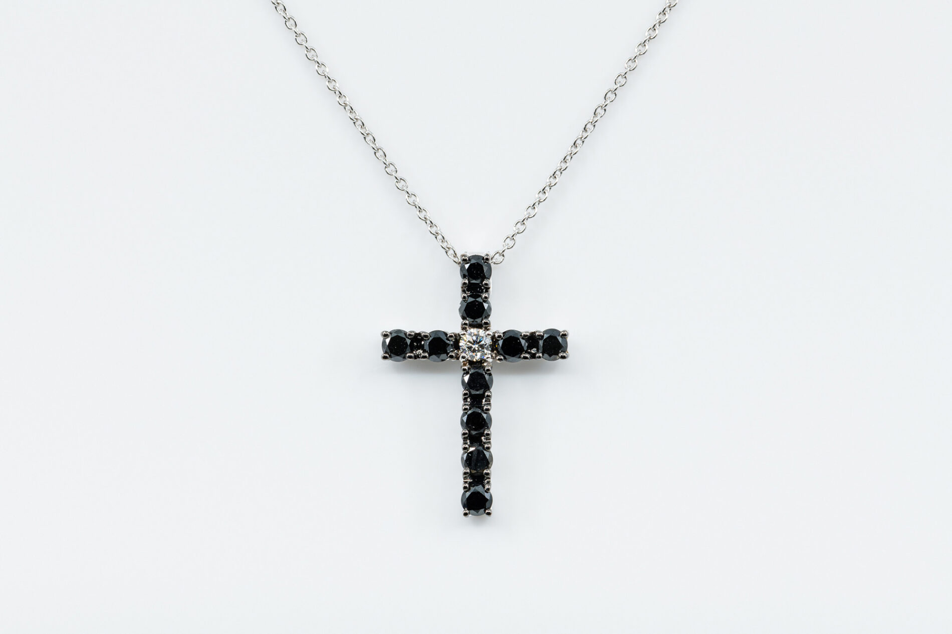 Collana croce diamanti neri Angelus base White è una delle creazioni più classiche ma eleganti della Gioielleria Casavola di Noci (BA). Una collana in oro bianco con diamanti neri dal design unico ed inconfondibile, su cui spicca un piccolo diamante bianco taglio “tondo brillante” proprio al centro della montatura!