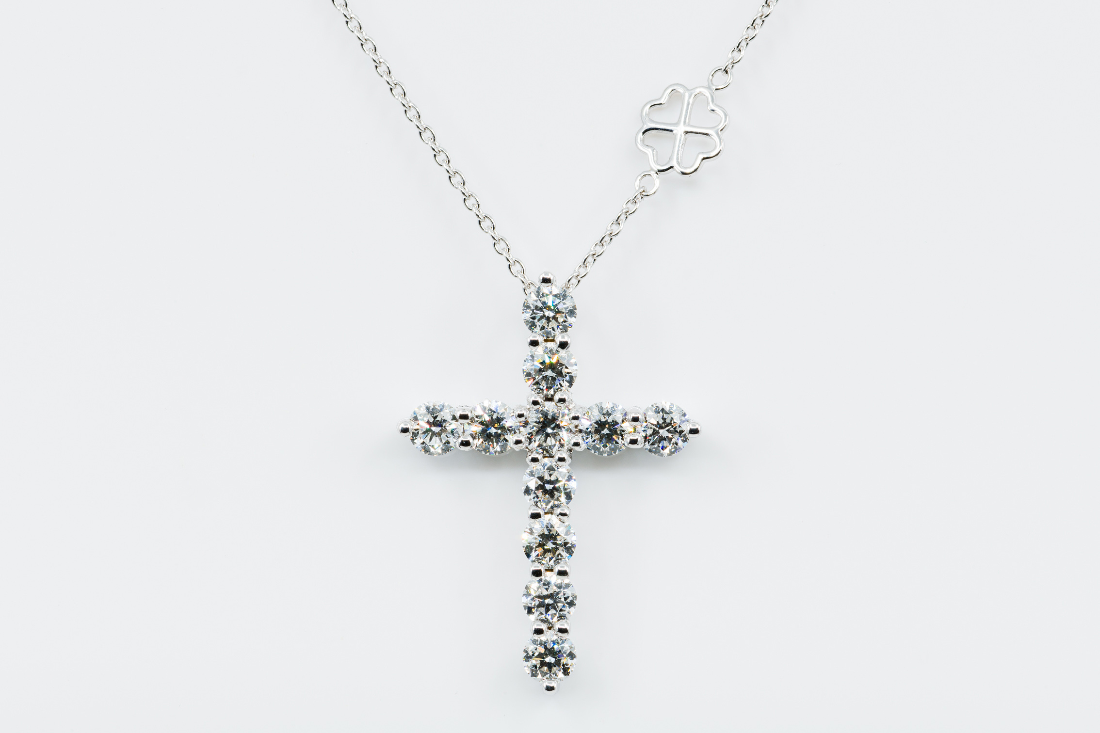 La particolarità delle croci Fidelis è la scelta delle pietre. Undici diamanti bianchi, per l’esattezza. Selezionati uno ad uno in base alla caratura ed alla figurazione. Tutti dal taglio tondo brillante, ovviamente.