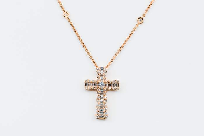 Collana Croce Fidelis Précieux rosé è una delle più importanti creazioni della Gioielleria Casavola di Noci (BA). Una collana in oro dalle caratteristiche uniche, frutto del lavoro dei gemmologi Dario e Fabio Casavola.