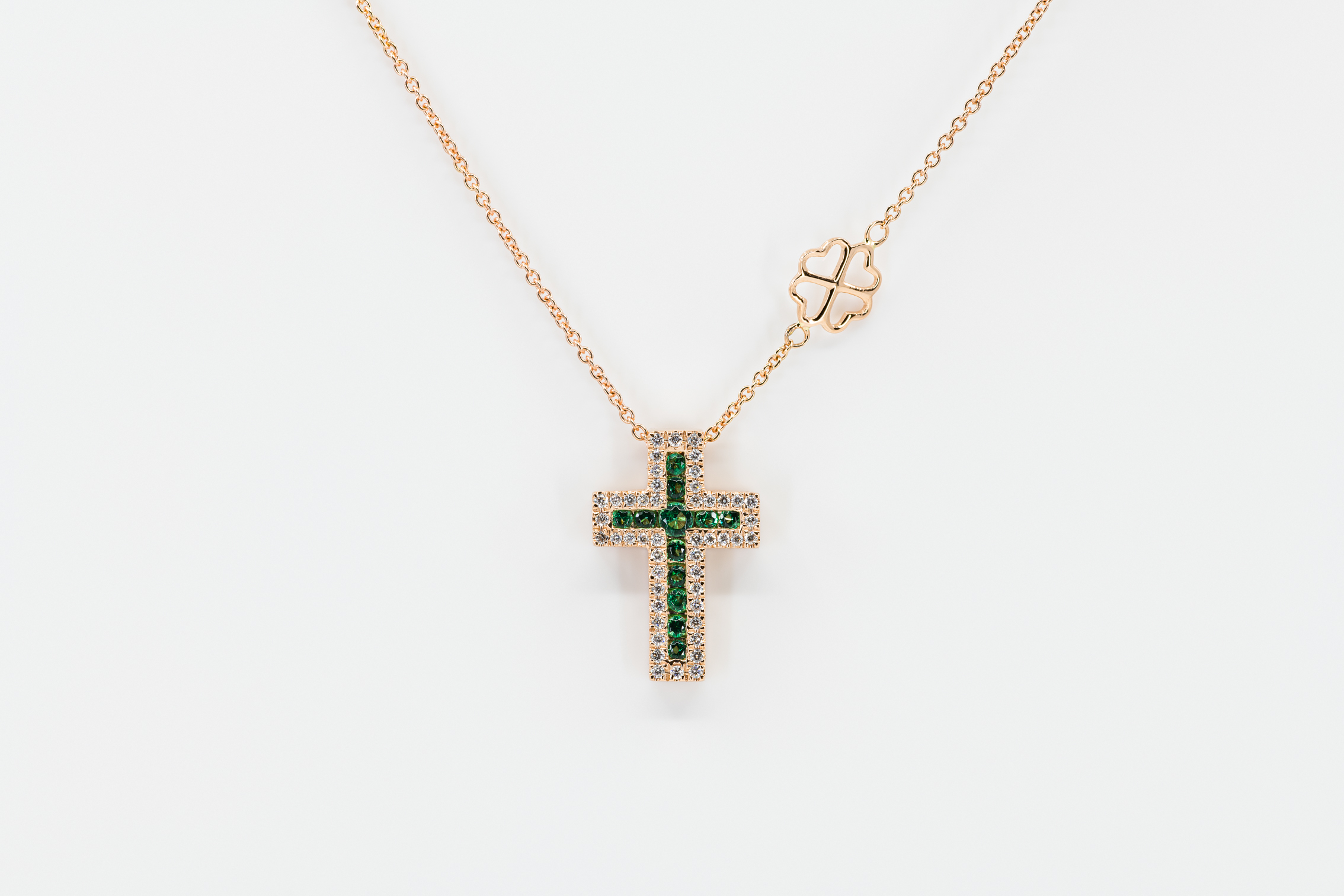 Collana croce Grand Angelus smeraldi rosè – Una realizzazione semplice ma d’impatto