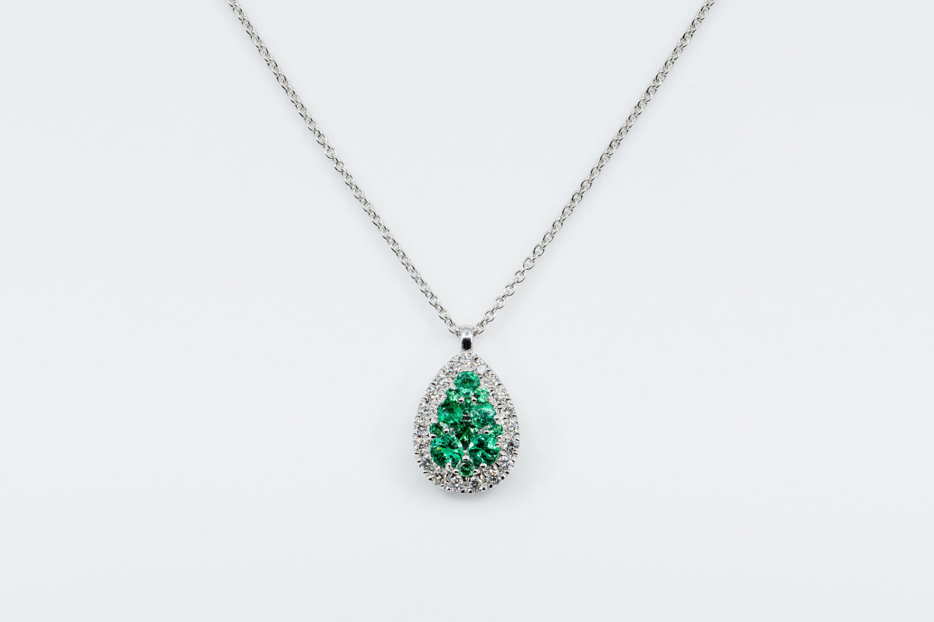 Collana goccia Liberty White in oro bianco 18 carati con diamanti e smeraldi realizzata dalla Gioielleria Casavola di Noci (BA).