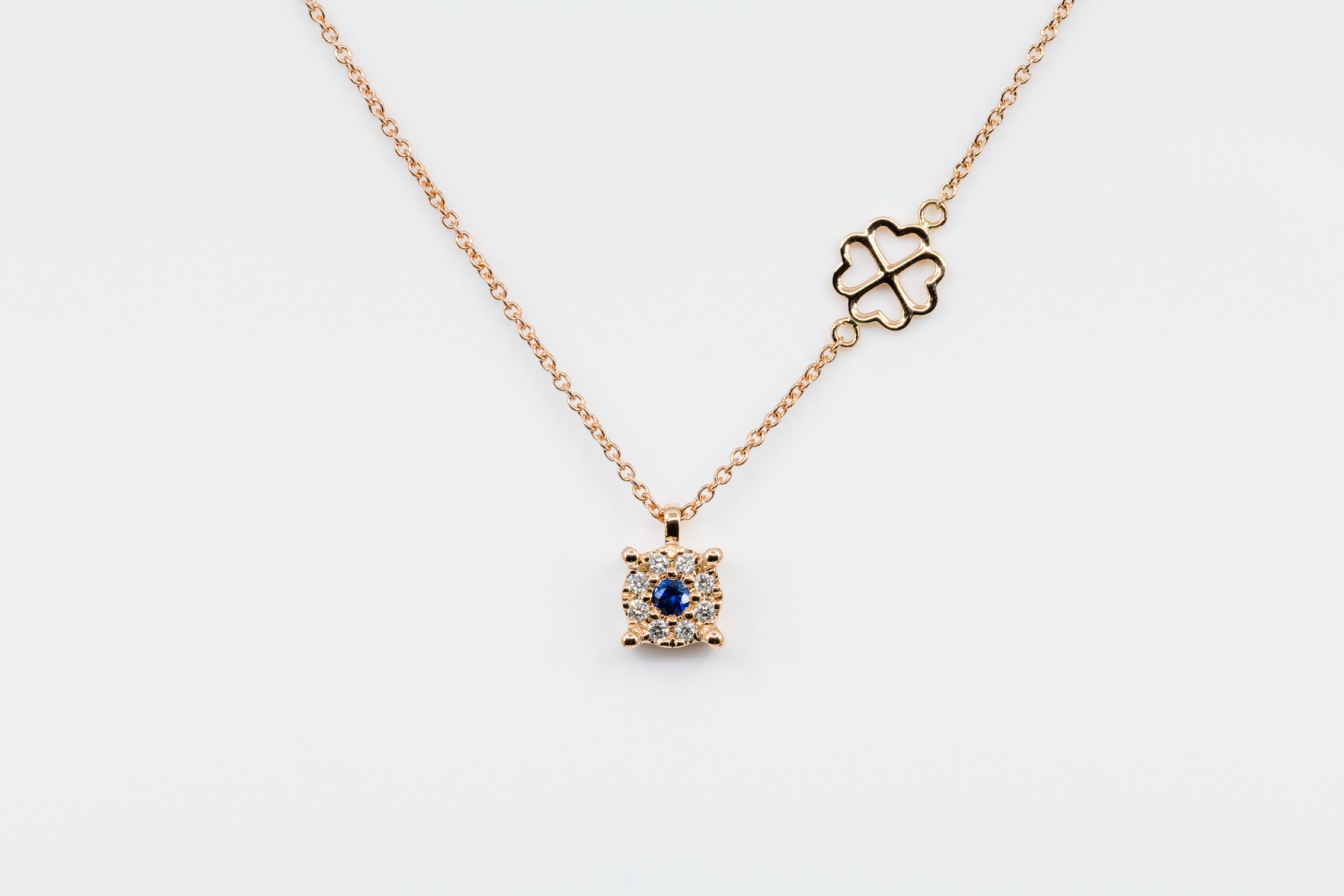 Collana Invisible Beau Saphir Rose è uno dei gioielli più intriganti e colorati della Gioielleria Casavola di Noci (BA). Una deliziosa collana in oro rosa e diamanti con al centro un piccolo zaffiro blu. Una colorata variazione sul tema “invisible”.