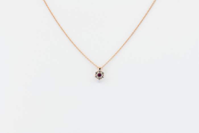 Collana Invisible Fleur Rubis Rose è uno dei gioielli più innovativi e colorati della Gioielleria Casavola di Noci (BA). Una deliziosa collana in oro rosa e diamanti con al centro un piccolo rubino rosso. Una colorata variazione sul tema “invisible”, resa possibile dalla montatura a forma di fiore.