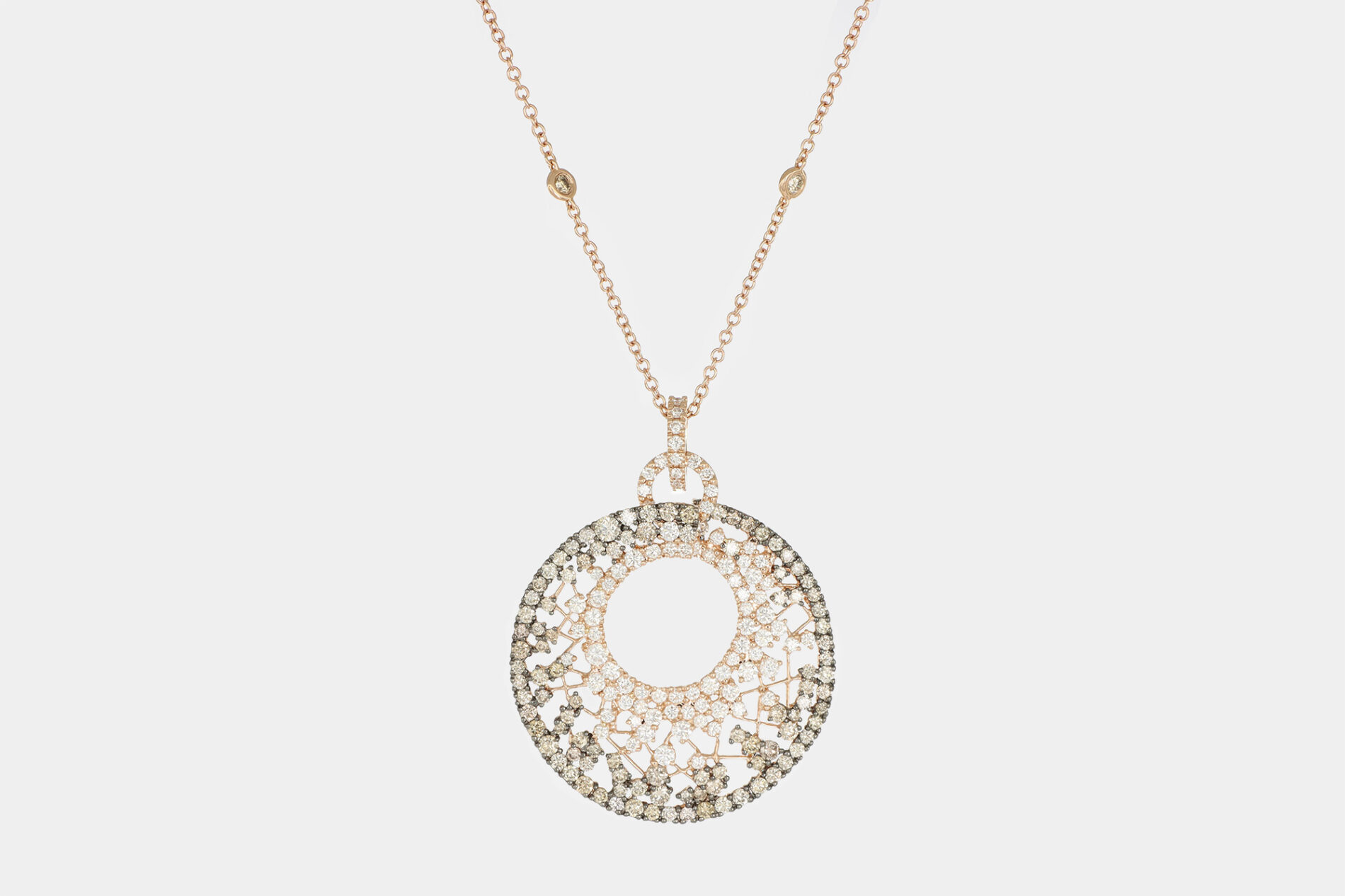 Le forme geometriche “base” come cerchi, triangoli o quadrati sono tra le più usate nella gioielleria. Soprattutto nella realizzazione di pendenti per collane ed orecchini. La semplicità delle forme permette inoltre di sbizzarrirsi con molteplici variazioni. Come nel caso di questa collana medaglione diamanti brown Rosè Prestige.
