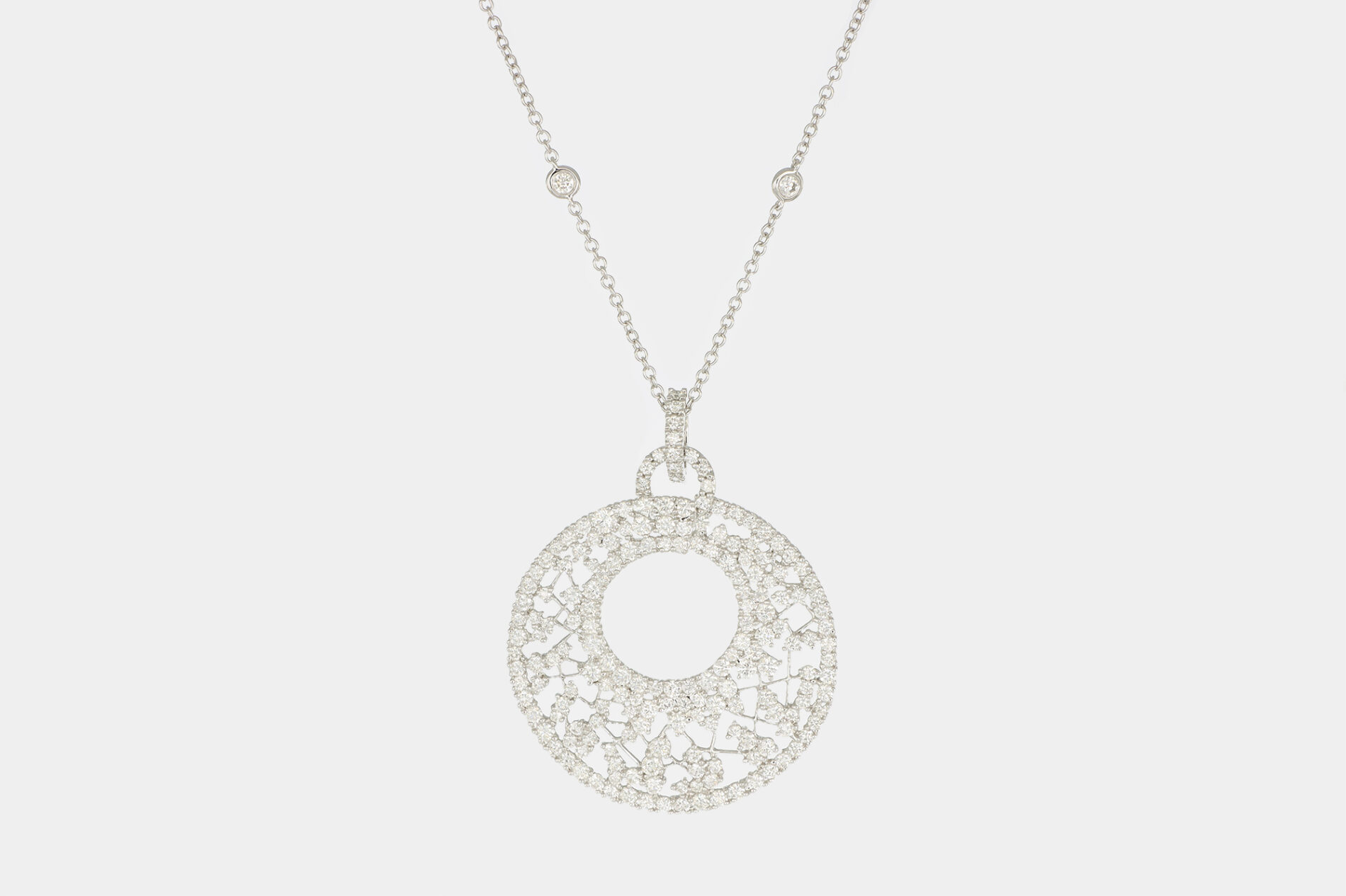 Le forme geometriche “base” come cerchi, triangoli o quadrati sono tra le più usate nella gioielleria. Soprattutto nella realizzazione di pendenti per collane ed orecchini. La semplicità delle forme permette inoltre di sbizzarrirsi con molteplici variazioni. Come nel caso di questa collana medaglione diamanti White Prestige.