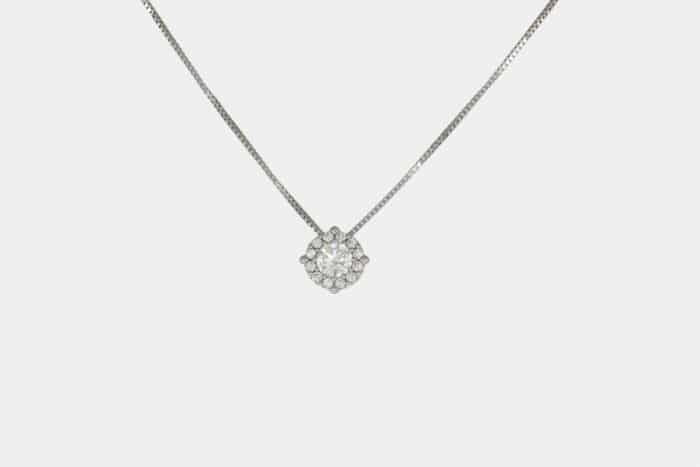 Collana oro bianco invisibile zirconi 5.35 mm è un gioiello di oreficeria dalla montatura semplice ed elegante. Una splendida idea regalo per le occasioni importanti, qui realizzata in oro bianco con uno zircone bianco/trasparente taglio “tondo brillante” al centro del pendente con tutt’attorno un pavé di zirconi.