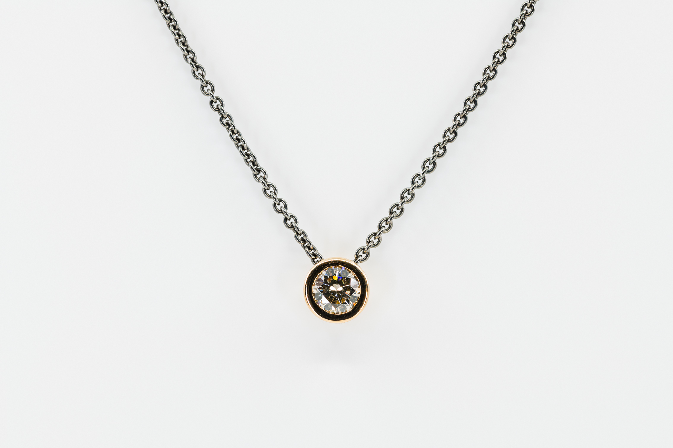 Collana punto luce uomo Big Diamond è un gioiello maschile molto affascinante ed importante. Una collana con pendente in oro rosa su cui spicca un diamante “brown” taglio tondo “brillante” con collana tipo “rolò” in oro brunito. Una idea regalo perfetta per lui, qui realizzata dalla Gioielleria Casavola di Noci (BA).