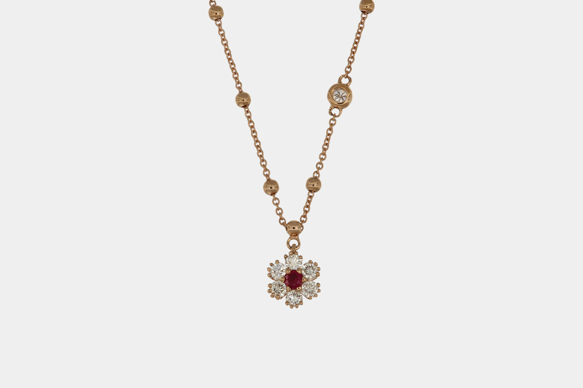 Collana rubino Altea Nature Rosè è un gioiello ispirato alle forme ed ai colori della natura. Una collana realizzata interamente in oro rosa su cui spicca un bellissimo rubino rosso taglio “tondo brillante” attorniato da sei diamanti. Un gioiello dalle caratteristiche uniche ed inconfondibili. Un’opera della Gioielleria Casavola di Noci (BA).