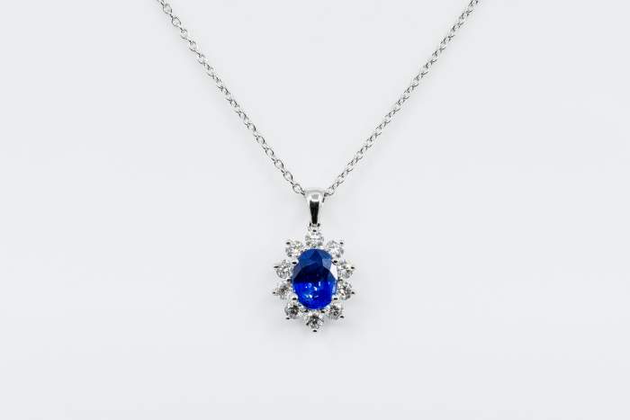 Collana zaffiro Sunflower Nature è un gioiello ispirato alle forme ed ai colori della natura. Una collana in oro bianco su cui spicca uno bellissimo zaffiro taglio ovale. Un gioiello con pendente dalle caratteristiche uniche ed inconfondibili. Un’opera della Gioielleria Casavola di Noci (BA).