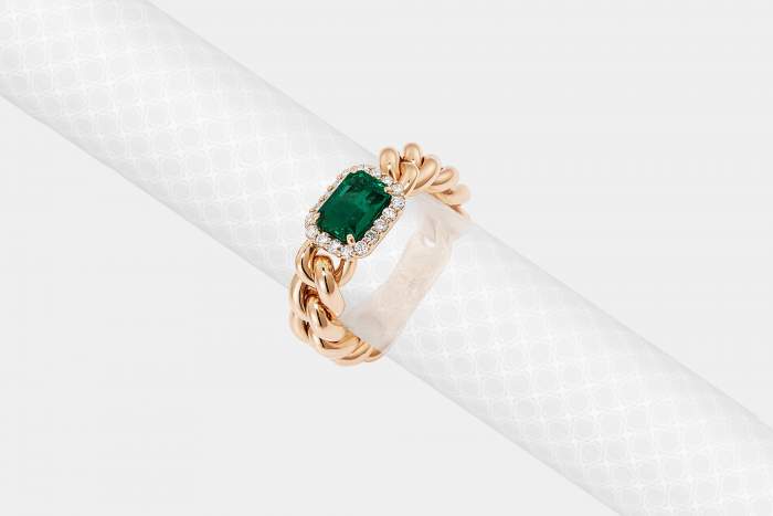 La parte che attira di più l’attenzione è però l’elemento centrale. Realizzato all’interno dell’anello stesso, su questo spunta un bellissimo smeraldo taglio ottagonale. E tutt’attorno alla pietra, un delizioso pavé di diamanti bianchi.