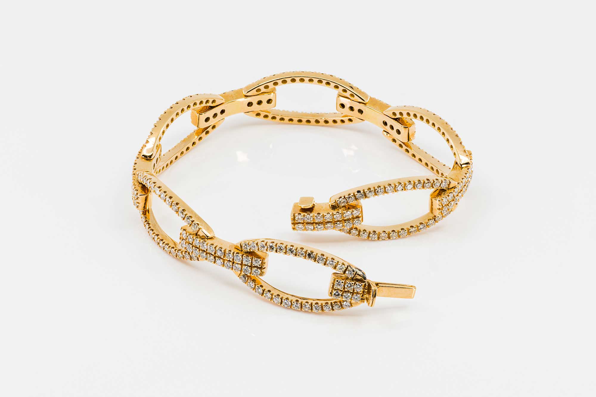 Immancabile e sontuoso è il pavé di diamanti sulle maglie e sulle barre. Oltre ad illuminare il bracciale, il pavé impreziosisce il valore di questa splendida creazione.