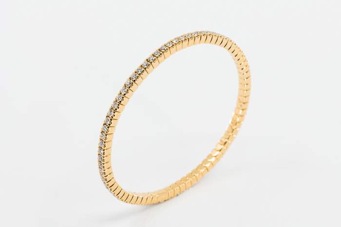 La montatura in oro rosa è particolare ed intrigante. Realizzato in maniera impeccabile dagli artigiani Crivelli, il bracciale è realizzato per essere completamente elastico. Questo avviene grazie ad una molla interna, qui ben inserita all’interno dell’ormai classica montatura “tennis”. Una realizzazione davvero famosissima, soprannominata “tennis” per via di una famosa sportiva d’altri tempi che amava indossarlo anche durante le partite. Un gioiello che gli orafi di Crivelli hanno realizzato in maniera impeccabile.
