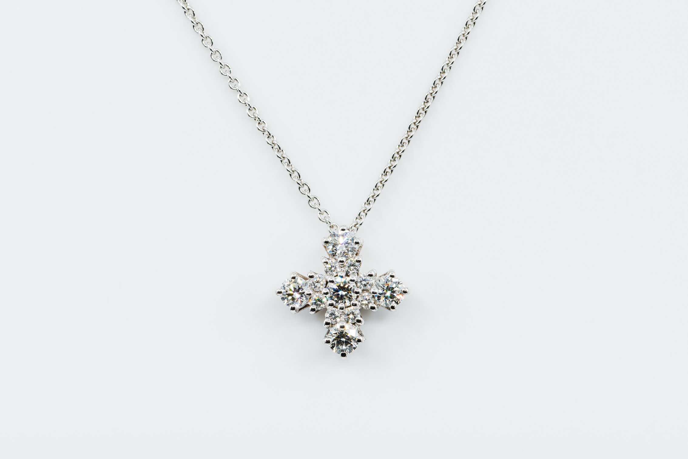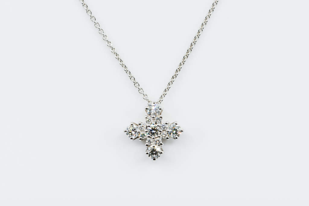 Essendo una collana con croce molto classica, la montatura in oro bianco è ben strutturata. E riprende sicuramente la forma della tradizionale “croce greca”, solo in forma un po’ più arrotondata.